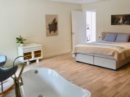 Er zijn 3 ruime gastenkamers van +/- 35 m2 tot 45 m2 groot. 2 kamers voor 2 personen, en 1 kamer voor 4 personen. Iedere kamer heeft een een groot kingsize bed en een eigen badkamer met stortdouche en een bad.